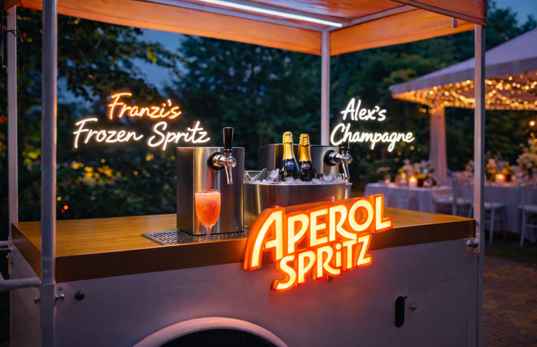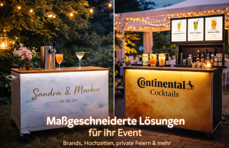 Stilvolle Aperitif- und Champagner-Bar mit Self-Service-Konzept. Individuell befüllbar, gebrandet und perfekt inszeniert – ideal für Hochzeiten, Firmenfeiern und besondere Anlässe.